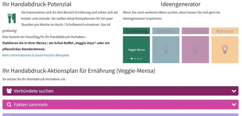 Damit wird dem gesellschaftlichen Fokus auf die Klimaproblematik Rechnung tragen und versucht auch alle dem Klimaschutz förderlichen Aspekte des Handabdrucks zu nutzen. Alle UserInnen die besonders motiviert sind ihre Klimawirkung zu verbessern, können sich am „CO2-Ergebnis“ orientieren, ihr Bewusstsein schärfen und folglich ihr Handeln „klimafit“ machen, ohne das größere Bild der globalen Übernutzung (Ecological Overshoot) aus den Augen zu verlieren. Die Erweiterung von Handabdruck-Aspekten bietet weiters eine Orientierung an den zahlreichen Möglichkeiten seine eigene Wirkung auch zu multiplizieren.